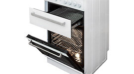 | Features | Oven/ Electric Grill Features ● Gas oven with separate electric grill ● Mechanical cooking timer ● Grill temperature range 50–250°C ● Oven temperature range 150–265°C (8 temperature options) ● Integrated ignition ● Triple-glazed glass door (oven) ● Cooling fan ● Oven light ● Easy to clean full glass inner door ● Removable oven cavity floor ● 5 cooking levels (oven) ● Active enamel interior ● 1 baking tray + 3 wire oven racks Cooktop Features ● 1 WOK burner 3.5 kW/hr ● 2 semi-rapid 1.75 kW/hr ● 1 auxiliary 1.0 kW/hr ● Enamel trivets and burner caps ● Flame failure device fitted to each burner ● Automatic ignition ● Single-piece 4 gas burner pressed hob |