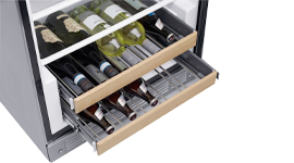 The included wine racks can fit up to ten bottles of wine or champagne. These racks are equipped with telescopic shelves to make them fully extendable. The top wine rack can be removed to store larger bottles. The racks are finished with a simple and elegant timber front.