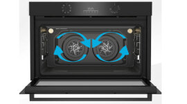 Dual fans distribute heat evenly throughout the spacious cavity, ensuring faster cooking times and consistent results across all shelves, even when preparing multiple dishes at once.