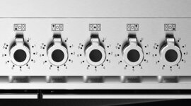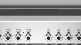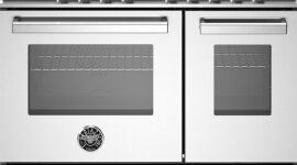 Crafted with stainless steel and ergonomic metal knobs, the range features a squared worktop, soft-close doors, and triple-glass oven doors for safety and style.
