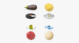 | Accessories included | 1 x main spindle, 1 x reversible shredder, 1 x adjustable slicer, 1 x S-blade and 1 x dough blade. |