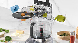 The integrated storage caddy is simple to use and houses the dicing kit, S-blade, reversible shredder, adjustable slicer and dough blade. They can be accessed independently and housed inside the bowl.