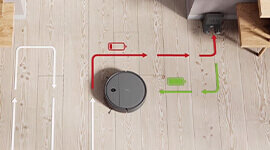 The robot automatically returns to the charging station when the battery is below 20%. Once recharged, the robot returns to the area where it left off and resumes cleaning.