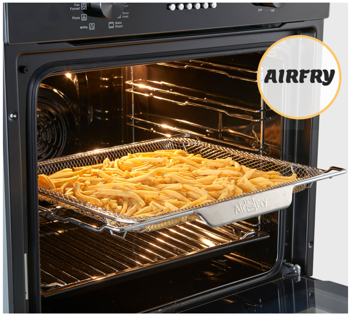 | Features | Design: A built-in model that can be mounted as a Flush or Proud fitting. Electronic Programmer: A digital clock that also can be used to set the time for the oven to switch on and switch off. Air Fryer: Cooks anything that normally requires turning such as chips, chicken wings, sausages, or crumbed fish fillets. Excellent for dehydrating foods. Cooling Fan System: Automatic Oven Cooling Fan System. Inner Oven Door Panel: One-piece fully removable Glass Panel for easy cleaning. Oven Door Cleaning: Removable Oven Door for cleaning. Electrical Connection: The oven has a 1.2M cord. This oven is fitted with a 15-amp plug. The oven should be installed with a unique circuit with the appropriate amps, not sharing the connection with other appliances. 9 Oven Functions: |