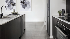 The gas on glass cooktop matches with the wider Haier family of appliances, pairing well with a black wall oven and other black appliances.