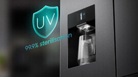 Plumbed for convenience and fitted with a built-in filter, this system uses UV technology to sterilise 99.9% of bacteria in every drop. From crushed ice to chilled water, enjoy cleaner refreshment straight from the door.