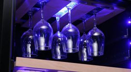 Your wine glasses can be elegantly hung in the top of the fridge. Storing them upside down in this way protects the glassware from collecting dust and makes them ready for use at any time.