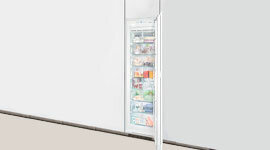 This freezer is designed to be integrated into a fitted kitchen. You can opt for one of two choices. The door-on-door system fixes the appliance door to the kitchen unit door. The sliding door system attaches the unit door with the appliance door using hinges and sliding rails.