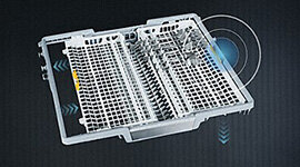 The 3D MultiFlex tray has a sunken central section and two side sections, capable of supporting small items like espresso cups. The left-hand section can be pushed to the right to create space for tall wine glasses in the upper basket. The depth of the right-hand section can be adjusted to easily accommodate large items of cutlery and small items of crockery.