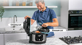 Comes with two separate cooking lids. The Pressure Lid for slow cooking, pressure cooking, sous vide, yoghurt, dehydrating, sauteing and steaming; the Crisping Lid for air frying, baking and grilling.