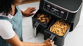 DualZone Technology offers two options: Smart Finish, cooking two foods in different ways that finish simultaneously, and Match Cook, syncing settings across zones for 9.5L capacity meals with ease.