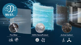 Combines a pre-filter, HEPA layer, and activated carbon to trap 99.97% of ultra-fine particles, allergens, and even airborne viruses as small as 0.003 microns.