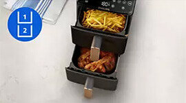 Featuring two 5L baskets, the 10L dual airfryer effortlessly handles family-sized meals. Cook up to 1.4kg of fries, 2kg of vegetables, or 24 drumsticks—perfect for batch cooking or serving multiple dishes at once.