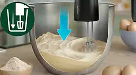 The extended reach ensures you can access all areas of deeper bowls while minimising splashes, and the Soft Start feature gradually builds power to prevent sudden mess, saving you time on post-baking cleanup.