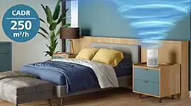 With a 250 m³/h CADR, this purifier cleans rooms up to 65 m² efficiently, purifying a standard 20 m² room in under 12 minutes for rapid improvement in air quality.