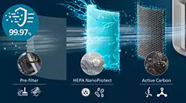 Combines a pre-filter, NanoProtect HEPA filter, and Active Carbon layer to trap 99.97% of ultrafine particles, allergens, and gases, delivering exceptional air cleanliness and freshness.