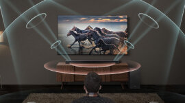Dolby Atmos technology with DTS:X creates an immersive sound field around you. Conventional soundbars shoot audio directly at you and that creates a two-dimensional sound experience. With Dolby Atmos, the upwards firing speakers send sounds to the roof, which then bounce down on top of you and immerse you in audio from above.