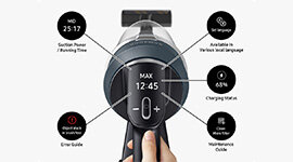 With a quick glance you can see suction level, remaining battery time and how much the vacuum has been charged. It even alerts the user if there are blockages in the brush for easy maintenance.