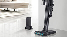 The self-standing, slim design of the Samsung Z Station means you can place it anywhere - no wall mounting required, while the slanted design makes it easy to park and detach the machine vacuum.