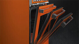 Smeg's pyrolytic oven cavity is designed to eliminate corners, holes and joints whilst every element inside the cavity can be easily removed: the upper grill has a tilting mechanism, and the side oven shelf brackets can be removed and washed in the dishwasher.