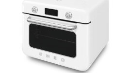 Features a polished white body, smoked glass door, and polished chrome accents, blending vintage aesthetics with modern craftsmanship. This countertop oven brings nostalgic style into contemporary kitchens without compromising on performance or functionality.